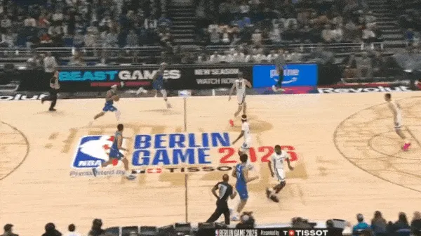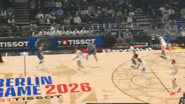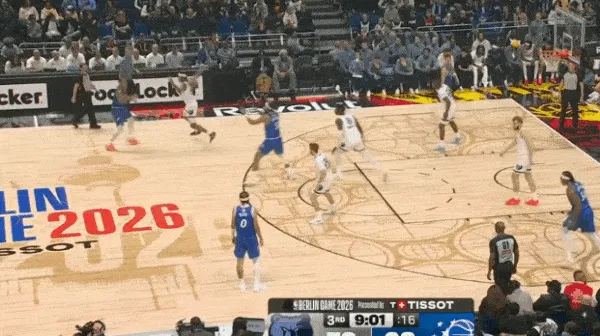 转换进攻布莱克持球过半场后见阿尔达马放两步防突放投,立即使用胯下拉回衔接撤步持球三分惩罚。